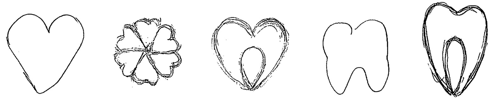 So… After creating the final SIX connections in the book, I drew six hearts meeting to a center point at their bases. Then, if you look closely, putting a ‘tear drop’ like petal inside each heart not only created a flower, it also actually created a molar, or two rooted tooth, at the same time. So, VOILA! The six-petal FLOWER, the TEETH as well as HEARTS all in one!!!